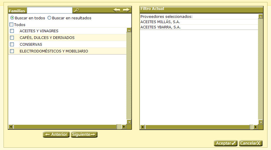 -Se puede comenzar desde cualquier filtro hacia delante, siendo la jerarquia: Proveedores-familias-subfamilias-gamas.