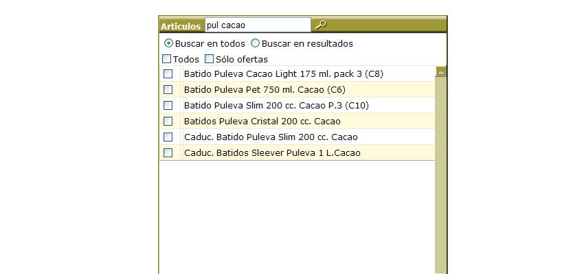 -Si por ejemplo queremos buscar todas las coincidencias que contengan PUL y CACAO, escribimos "PUL CACAO", y pulsamos el botón de búsqueda.