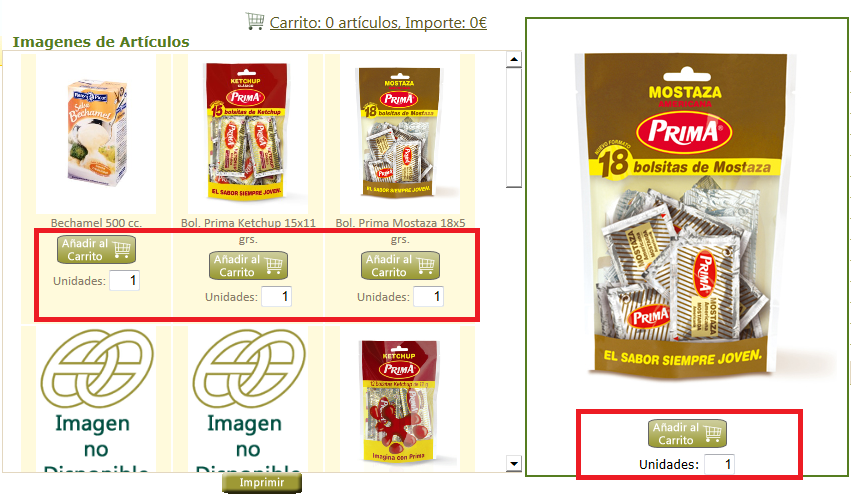 -Para confeccionar un pedido, se ha añadido tanto en la pantalla donde se muestran las imágenes como en la ficha de los artículos un enlace para añadir los artículos al carrito,